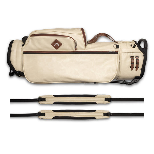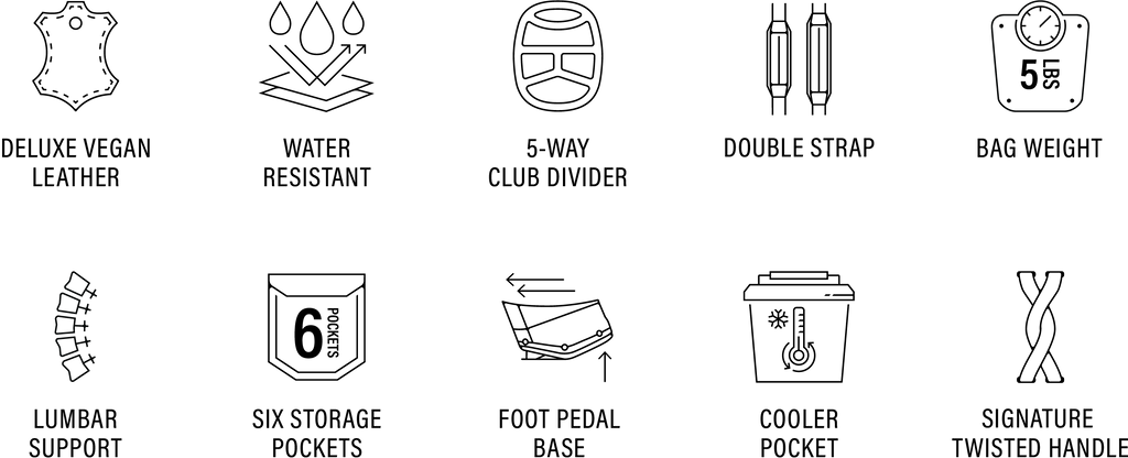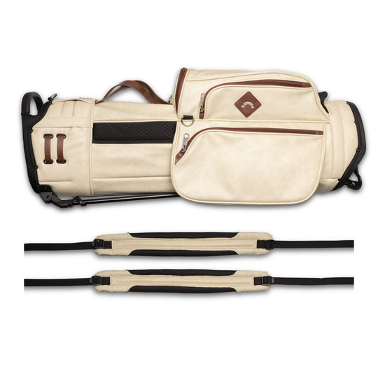 Designed with a versatile single or double shoulder strap configuration the Trouper 3.0 is your ideal companion on the course. A large insulated front cooler pocket has enough space to keep four 16oz cans cold. The two newly improved fleece-lined valuable compartments and seven-pocket design secures valuables while allowing for straightforward access. A large five-way divider allows for simple organization and an easy pull for all 14 clubs even with oversized grips. Simply put the Trouper 3.0 delivers an effortless and reliable experience for any player round after round. Featuring All-New Straps and a bolstered stand mechanism.
